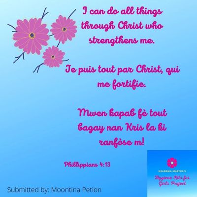 With a heart full of compassion and a needle in hand, Joyce has sewn hundreds of hygiene kit bags for our Grandma Martha Hygiene Kits for Girls project. Every stitch she makes carries the love of Christ and a desire to uplift girls in Haiti with dignity and care.
